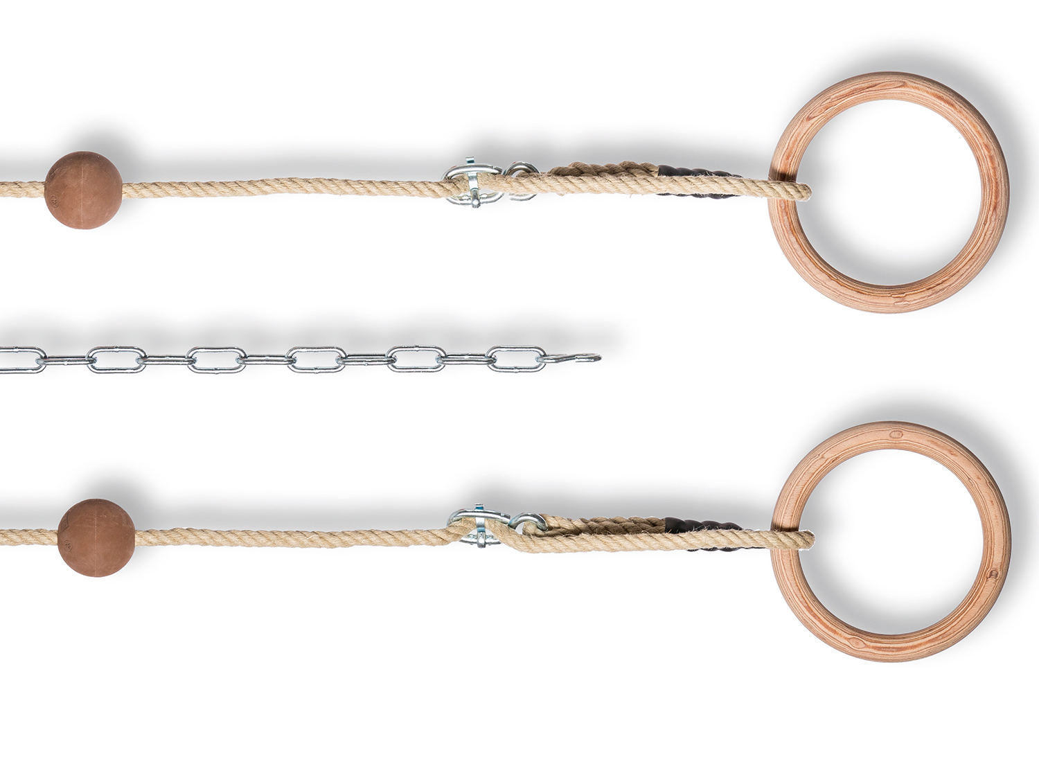 Jeu complet avec anneaux en bois multiplis et chaînes, cordes en chanvre de fibres longues, Ø 16 mm, poids de lestage en caoutchouc plombé.