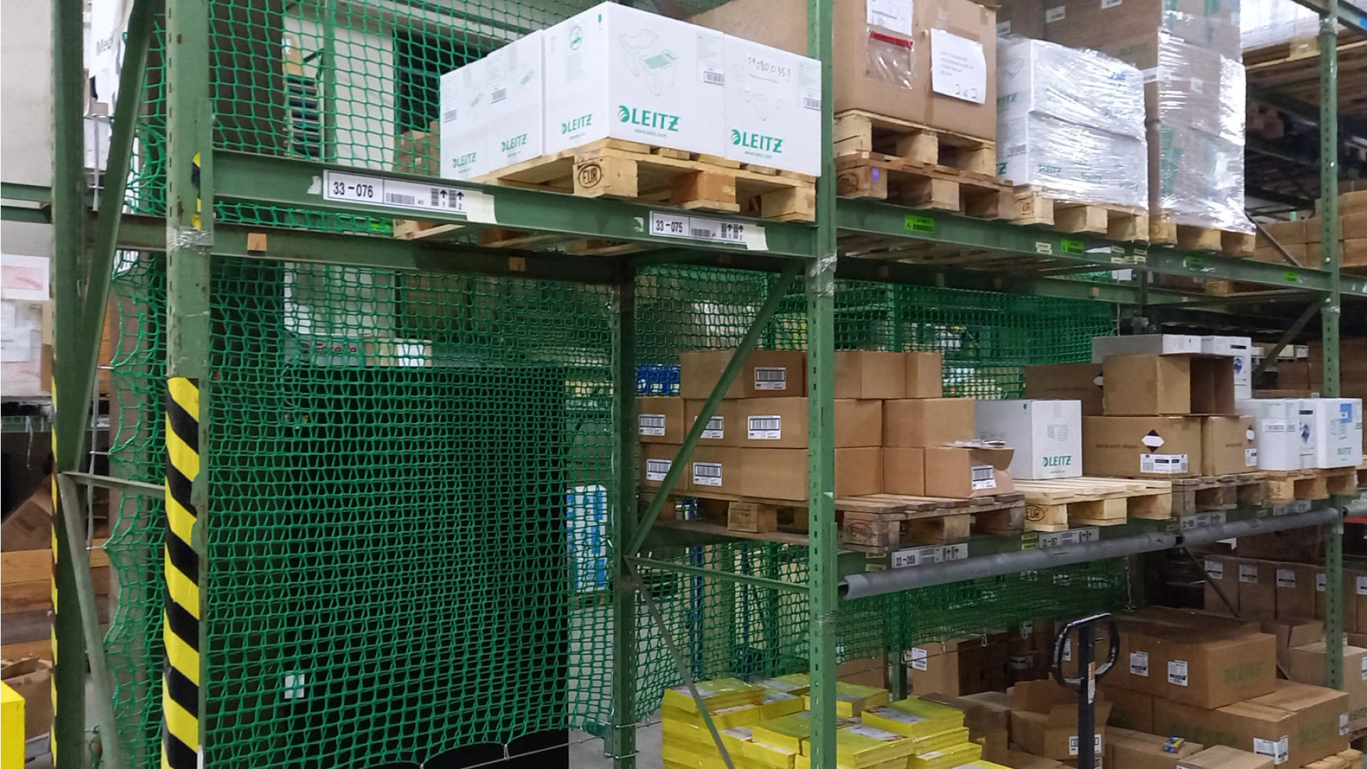 • Filets pour rayonnages à palettes : empêchent les palettes ou les marchandises de tomber des rayonnages, tant à l'arrière qu'entre les rangées de rayonnages.